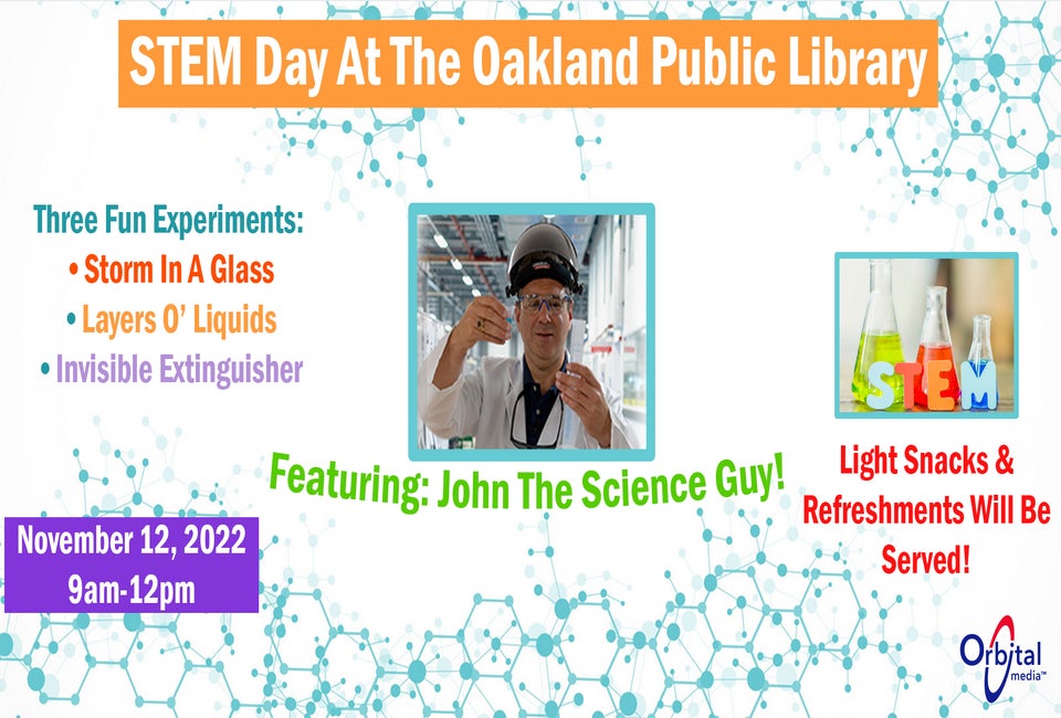 Spend a STEM day at Oakland Public Library, featuring John the Science Guy conducting three experiments. Soak up some great knowledge, have fun and nibble on some snacks.