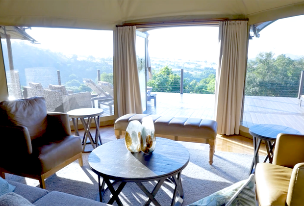 The resort offers 20 separate glamping suites accommodating 2-6 guests in luxurious safari-style tents. Expect top-of-the-line amenities and West African, safari-style decor. Each private suite has its own bathroom with running water, plus access to shared outdoor entertainment including fire pits, games, an on-site spa, and event spaces.