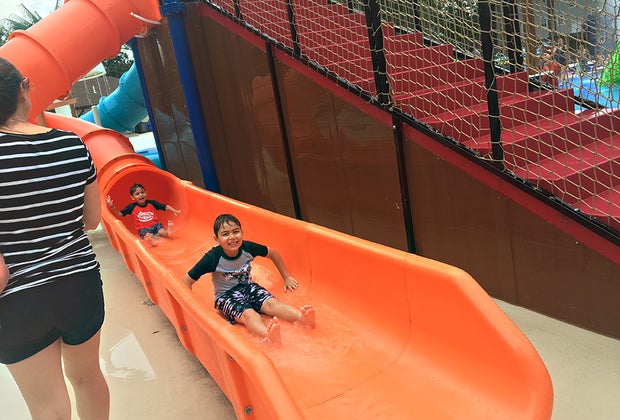 After slathering on sunscreen on my kids, the Surf Shack caught my boys' eyes (ages 5 and 8). This tower holds two twisty water slide tunnels, and an enormous bucket that dumps water on people below. I was very impressed that the park dedicates two staff members to this feature. One stays at the bottom of the steps, carefully allowing only two people to climb the stairs at a time (no pushing or elbowing here!), while another staff member keeps an eye at the bottom of the slide to prevent crashes from lingering riders.