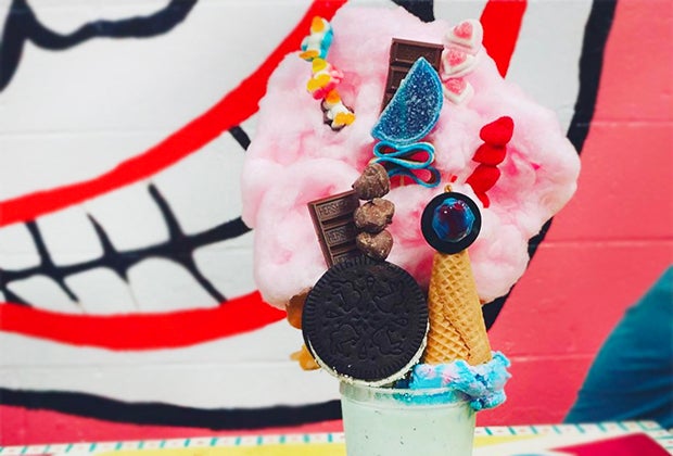 The best-selling Sideshow Shake starts with the ice cream flavor of your choice whipped up into a creamy milkshake. It’s topped with a waffle cone, ice cream cookie sandwich, fluffy swirls of cotton candy, a Ring Pop or rainbow lollipop, strips of sour candy, and finally, a chocolate-covered pretzel... whew!