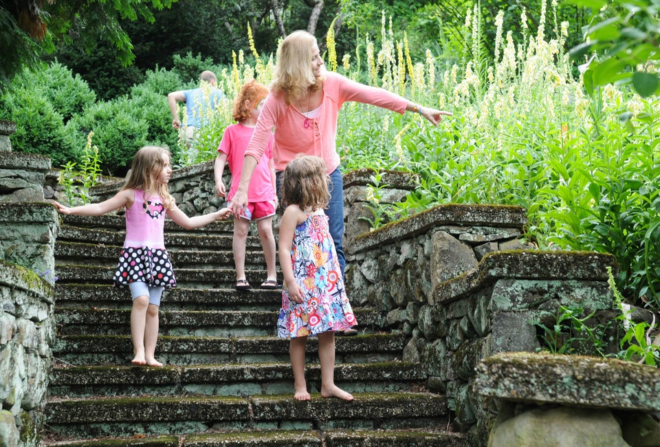 Pay your admission fee and pick up a map at the main house before setting out onto the garden path. You'll immediately see the reflecting pool terrace, once the scene of 1920s and '30s lawn parties. The kids leaped down the wide staircase and peered into the former pool, taking in the scene of neatly organized hedges, plants, and grand stone columns. Further down, a bronze sculpture of a little boy holding two geese caught the adults' attention.