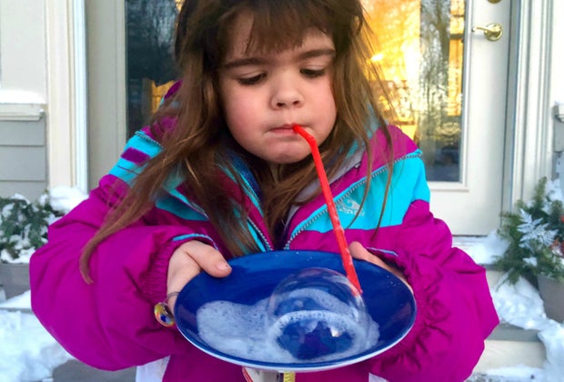 We saw these mesmerizing bubbles popping up all over our feeds, and couldn't wait to give it a try IRL with real kids. Read on for the recipe and see our video of this DIY science experiment in Connecticut, a day after the dreaded "bomb cyclone," aka, Winter Storm Grayson.