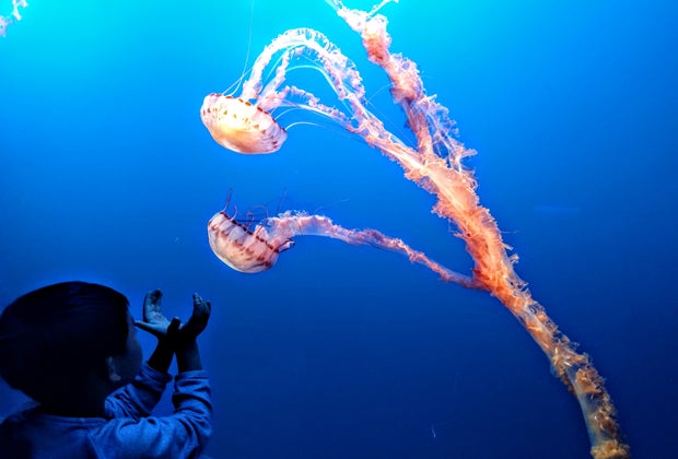 Mystified by jellyfish at the Monterey Bay Aquarium.