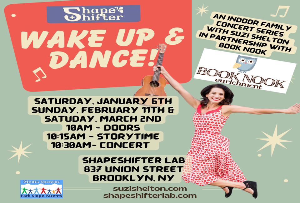 Suzi Shelton presents a joyful winter concert series for the littlest dancers, in partnership with the Book Nook. Come in from the cold, warm up with some hot drinks from the café, and kick off your weekend with musical fun by Suzi Shelton and friends!