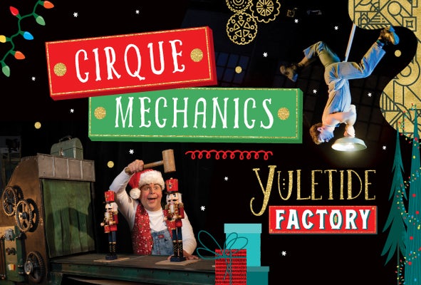 The merry daredevils of Cirque Mechanics (Zephyr, 2023) are back with an industrial-strength spectacular, transforming a drab assembly plant into a holly jolly Yuletide Factory! From the wonder of the German wheel to festive flips from the trampoline wall, they dash and dance through a pageant of powerhouse stunts with grins and goodwill.
