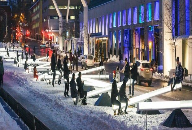 12 over-sized illuminating seesaws radiate light and emit musical elements, creating an exciting ‘urban playground’ in the heart of Midtown and transforming Broadway into a gleaming winter wonderland.