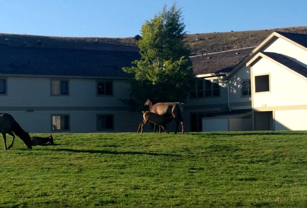 A fawn nurses on the lawn outside of Mammoth lodge.