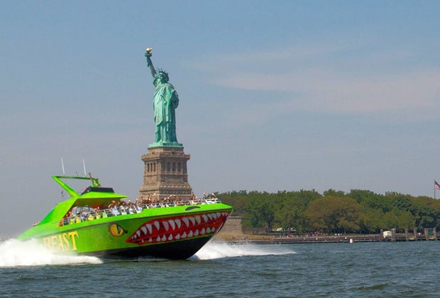 Take a super fast thrill ride past the Statue of Liberty on The Beast. Photo courtesy of NYCGo