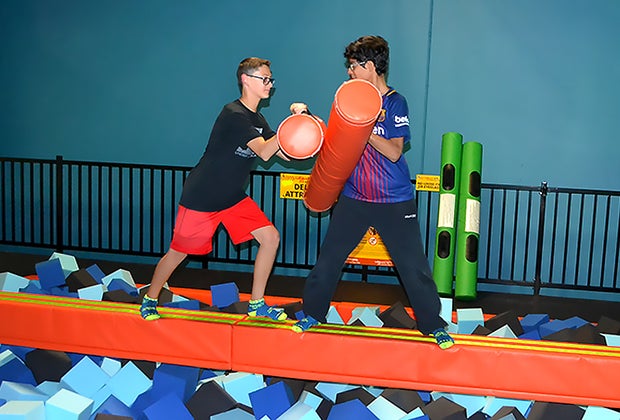 Behind the trampolines, is so much more to explore. There is the Battle Beam, where kids can joust their friends or their parents; the Jump, Duck and Dodge – a very Wipe Out-esque game; an area for dodge ball games, and the Urban Warrior Course. In this area, there are different levels of skill from beginning to warrior – where you hang, climb ropes and jump your way through obstacles similar to American Ninja Warrior.