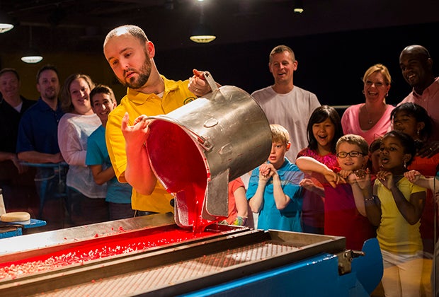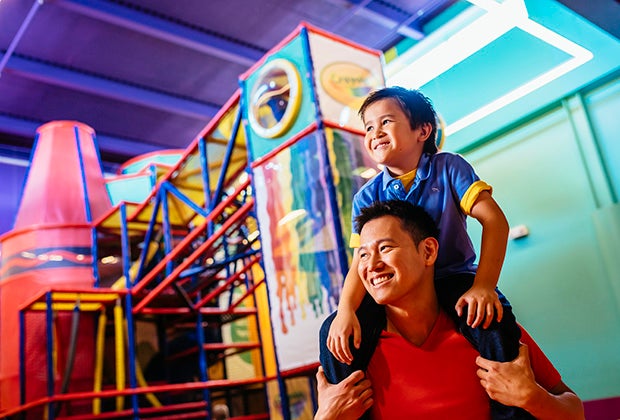Part creators’ studio, part indoor playground, this 65,000-square-foot kid entertainment center is bedecked in bold primary colors with smiling crayons beaming at you from every corner. It offers more than two dozen art-making stations using the full spectrum of Crayola materials—paints, clay, markers and yes, crayons—as well as more active entertainment like a multilevel play, bounce and climbing structure, toddler section, a water table with boats, and a “Cool Moves” dance-like crayon-themed game.