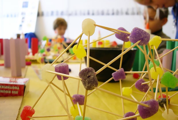 Children create their own architectural wonder inspired by the museum's exhibits and the real-life towers beyond.
