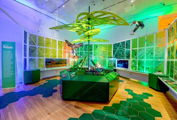 There are plenty of educational opportunities and nods to how color plays a key role in nature. From the bright yellow golden poison frog to the leaf-tailed geckoes, a small collection of live animals in the exhibit helps visitors to understand the essential role color plays in keeping these fascinating creatures safe.