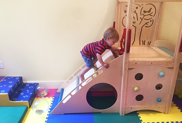 The padded play area includes toys, a modest climbing structure, play kitchen, and more.