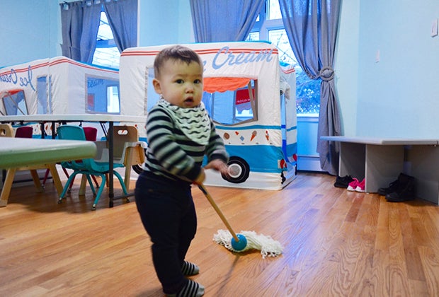 Older toddlers will get a thrill out of playing pretend with a kid-sized pizzeria, café, and market, equipped with adorable shopping carts and other miniaturized items. For little ones looking to play dress-up, a walk-in closet bursting with costumes is a real treat. Another nook is loaded with all things wheels, so trains, trucks, buses, and cars, plus a fun road map on the floor. There’s even an outdoor space with slides, playhouse and pretend gardening unit, which is open year-round (weather permitting).
