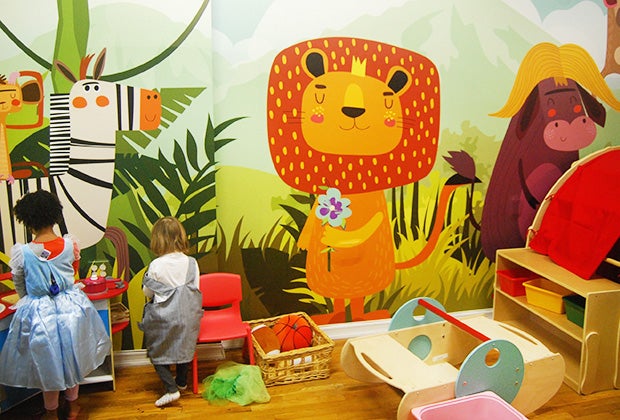 The larger room in the back is a preschooler's paradise featuring an art corner, dress-up area, book nook, play kitchen, play tent, rocking boat that seats at least four kids, chalk wall, and climbing wall with a mat. Kids will find more toys and puzzles in bins on the shelves, and can make music with their feet on a giant floor piano.