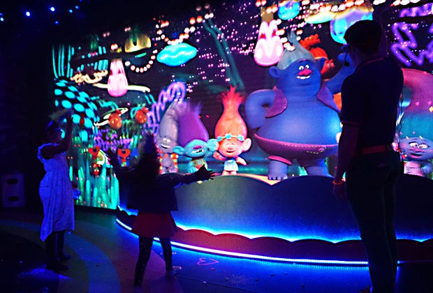 While everything from the makeover to the glitter chasing, music making, and high-fiving is tons of fun, you've now finally arrived at the big moment: Poppy's Best Day Ever Party. With technology from 3D Live, the party centers on a 10-by-25-foot 3D screen where Poppy, Branch, Guy Diamond, and many of their friends take turns rocking out to your favorite tunes from the Trolls soundtrack. A disco ball, flashing lights, and plenty of space to dance along make this a memorable (almost) finale.