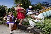 Led by a music therapist on the banjo, guitar, sax and harmonica along with a fiddler and a guitarist, the tunes will have the kids up on their feet in no time. The juggler and the big green frog turn the concert into a fun event for all. Playing Columbus Day as part of the Just Kidding Series at Symphony Space.