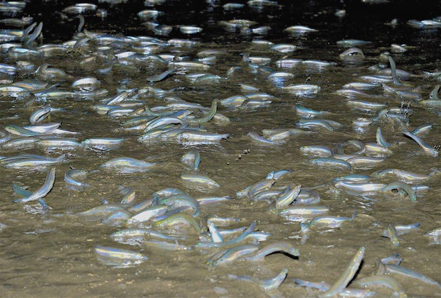 Anywhere from a dozen to a thousand fish may wriggle up the beach when the tide turns.