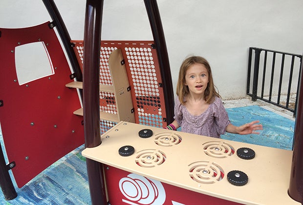 My 6-year-old stood at the entrance, quickly surveyed the new scene, and made a beeline for the monkey bars. The circular rungs caught her eye and gave her a chance to show off her skills. As an avid climber, she also loved the two nets built into the play structure and scaling up and down a vertical tunnel. While the playground is not expansive, there is plenty to discover. Separate from, but adjacent to the main play area is an adorable little house complete with a stovetop, shelves, and a window to peek from. The tiny house invites imaginative play, as did some other thoughtful components.
