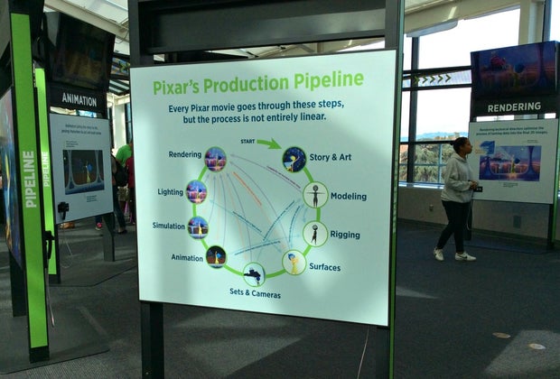 The exhibit itself is large, colorful, interactive, and non-linear: visitors can move to any open station, since (as we learn) the production process itself is not completely linear. Pixar’s animation production pipeline provides the map to the exhibit, with more than 40 stations for modeling, rigging, surfaces, sets and cameras, animation, simulation, lighting, and rendering. Movies including Inside Out, Toy Story, Brave, WALL-E, Monsters Inc, Finding Nemo, and more provide examples for each activity: How did Pixar create the perspectives in A Bug’s Life? How did animators create changes to time and mood in Up? How did they differentiate surface textures in Cars, or add attitude to movement in The Incredibles?