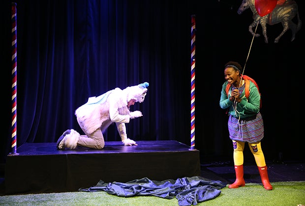 At the outset, Emma pleads with the carousel operator to get the broken ride operating again. He sweetly suggests patience and that she "play" with her new friends, at which point he gestures to the audience, the floor full of tots, eyes shining up, like, what? And she does. She takes the whole audience on her adventure, as the friendly polar bear—also played by Schraml who now dons white fur patches and a bear headpiece—comes to life.