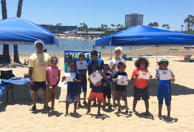The class is the same every week, culminating in a certificate ceremony, but there is an incentive to return: students who return three times in a season are invited to participate in an end-of-season Advanced Paddle family trip in late September, kayaking seven miles up the coast on the open water to Venice Beach and back.