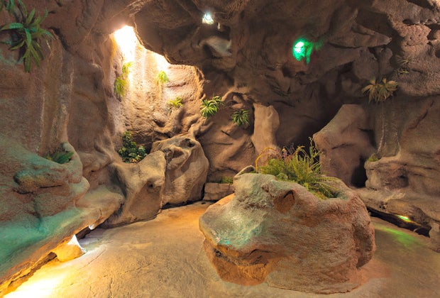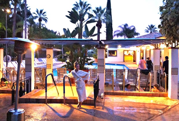 Glen Ivy is an hour and forty-five minutes east of Los Angeles—just long enough to forget what a diaper smells like. Any remaining fear I had that I would be prancing around all day in a state of nature was allayed upon entering the reception area, by the sight of an enormous and beautiful gift shop teeming with bathing suits (in case you fled the nursery so fast that you forgot to bring one). The grounds offer a total of 19 pools including thermal mineral baths, hot and cold plunges, a lap pool, a saline pool, saunas, steam rooms, showers, and mud all nestled along a lovely garden path. There's also an option to attend fitness and wellness classes, or for an extra fee indulge in individual spa treatments—or something mysteriously named The Grotto.