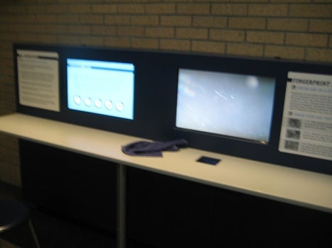 The first was the fingerprinting station, where kids can inspect their own enlarged fingerprint and compare it to the three styles of finger prints humans possess. Here we found out mine is a loop and his is an arch – and the arch is really rare. The second was an interactive memory quiz, where you choose different scenes and memorize them then answer questions to see what you remember – much easier for the kids than for us distracted adults.