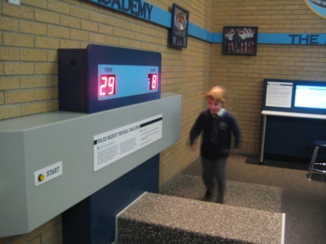 The final challenge was his absolute fave – the agility test where kids learn how many times they can run up and down a small set of stairs to press a button on either side in an allotted amount of time. They also had some fun sit down, kid, friendly crime scenarios to read aloud and then decide whodunit.