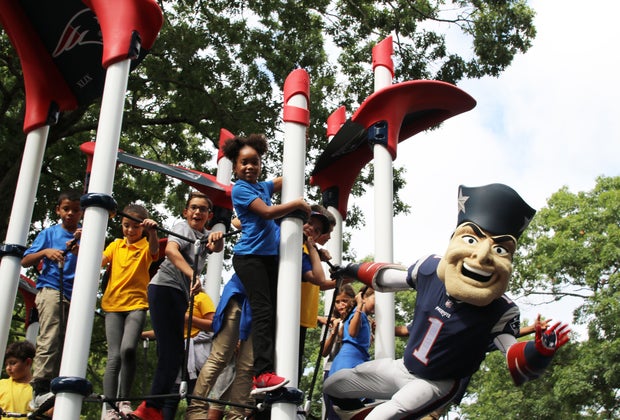 Pat Patriot greeted newcomers to the Fall River playground in the fall. Photo courtesy of the New England Patriots