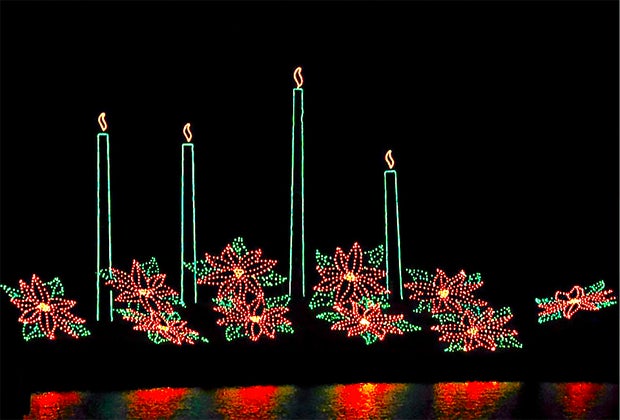 Displays include an ice palace, Santa on a Harley, a snowflake palace, campfire fun, and sea creatures.