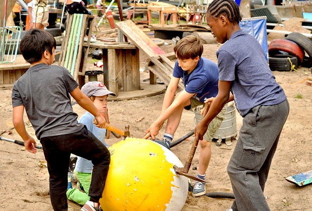 Kids 6 and up can tinker with loose parts and atypical objects (think cardboard, rope, wood planks, tires) as they work toward creating something out of this world. Photo courtesy of The Yard