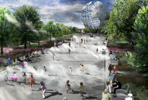 The long-anticipated redevelopment of the plaza between the Unisphere and the Fountain of the Planets in Flushing Meadows Corona Park is on track for a late-summer completion! The three fountains built for the 1939 and 1964 World's Fairs get a substantial update, including spray jets and a mist garden, and Parks Department officials confirmed they should be flowing before the end of the season. We're already hoping for a late summer heatwave and more time to enjoy this spectacular water playground since sprinklers are generally turned off once the temps dip below 80 degrees regularly. The revamp plans also include fresh landscaping and more places to relax around the fountains.