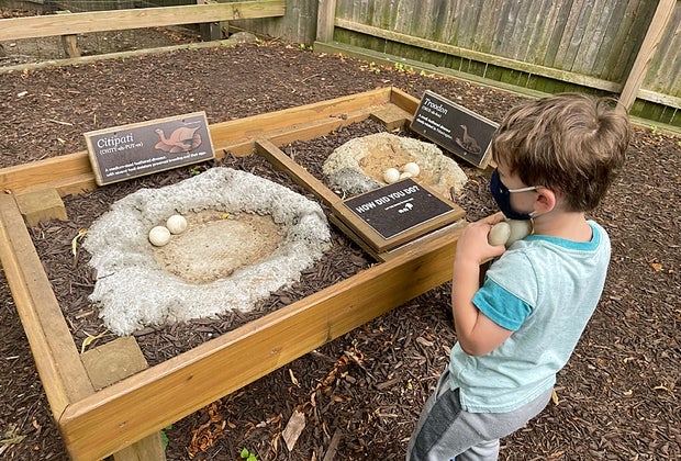 Outside, find more live animals, including peafowl, emus, goats, and owls. There is an egg-sorting exhibit, where kids guess which type of egg came from which dinosaur and sort them into their proper nest. The best addition for 2021 comes as you round the corner outside and come face-to-face with an animatronic Triceratops and its baby. The fiercest dinosaur, the Tyrannosaurus rex, is by the interactive dig site. Here, kids can use brushes to swipe away rocks and reveal dinosaur bones before moving on to the mining station.