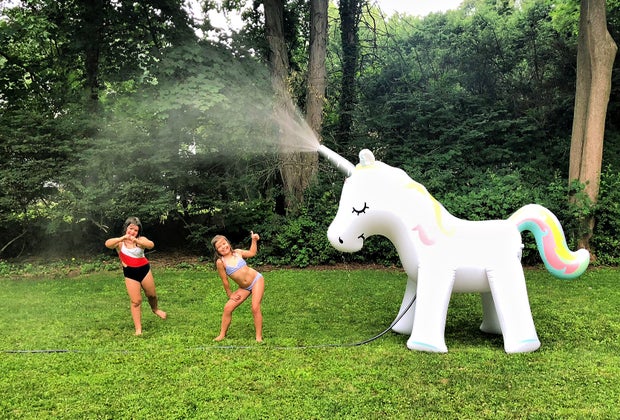 Just try not to laugh while playing under the giant unicorn sprinkler. Photo by Ally Noel