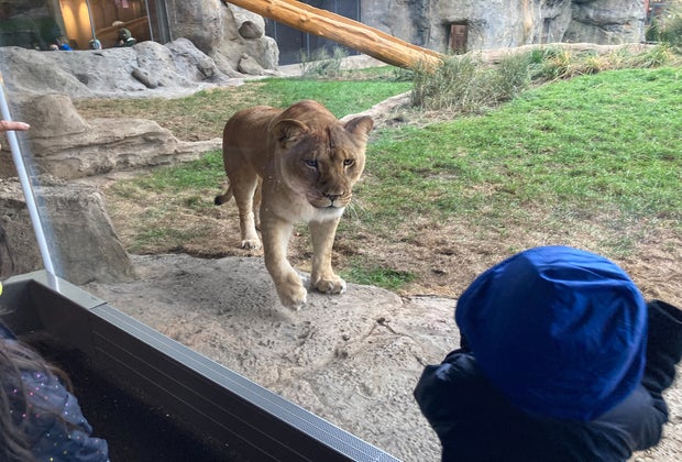 The zoo's docent encouraged us to go inside the building and look up, telling us we might be surprised at what we saw. The main portion of the building has maintained its original historic architecture, with beautiful vaulted and tiled ceilings, but the impressive part is the newly built Lion Loop, a circle that extends past the wall of the original building into the outside habitat. Kids can look up through glass skylights to see the lions from below. You can also view the lions on top of the building through windows on the sides—we saw one watch as kids moved back and forth on our side of the glass before she jumped down to greet them face-to-face, with her paw just inches from our kids on the other side of the glass. This perspective lets you see just how big the lions really are, the texture of their fur, and how they are watching each other and the people in the exhibit.