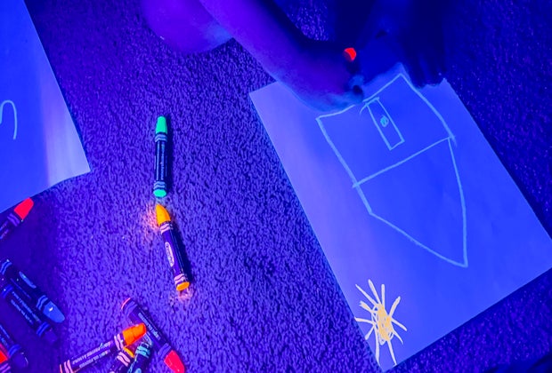 Channel your inner raver—toddler style—with a cheap black light and some highlighters or neon art supplies. You can even make neon rice for an added sensory experience.