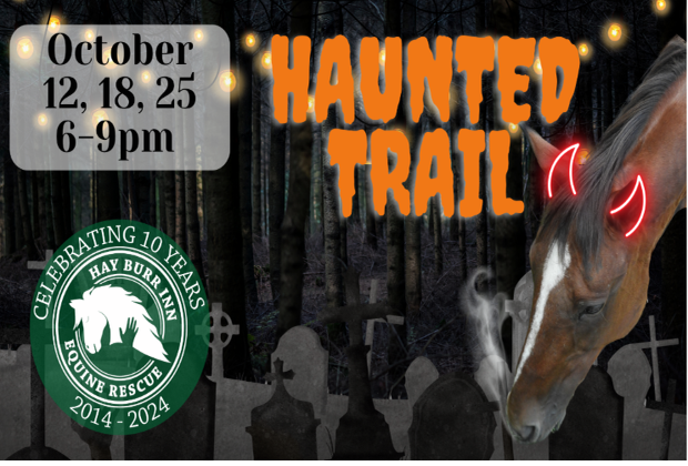 Get ready for an evening of thrilling adventure and heartwarming hope at the Hay Burr Inn Equine Rescue & Sanctuary. Dare to walk close to half-mile spooky trail that winds through the dark woods of our sanctuary. You can choose your own path and your own level of fear.