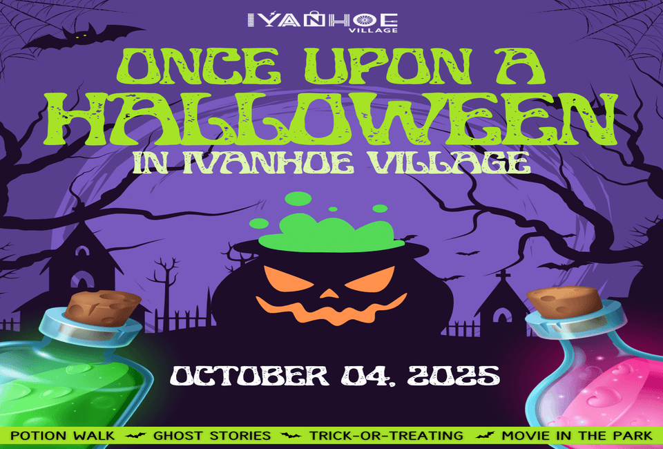 Get ready for a hauntingly good time and welcome the Halloween season in style! Get ready for a spine-tingling evening of potions, bites, frights, and festive delights– all while supporting Ivanhoe Village. Activities include ghost stories, trick or treating, and a movie in the park as well.