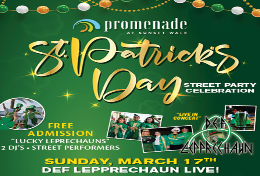 Join Promenade at Sunset Walk as it hosts its annual St. Patrick’s Day Street Party and Celebration, featuring a fantastic lineup of music, entertainment, and more. This year, guests can expect street performers, lucky leprechauns, green food and beverage specials, and appearances from top local DJs.