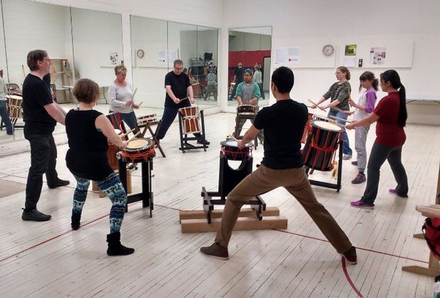 Students learn the art of Taiko Japanese drumming. Photo courtesy of Kyo Daiko