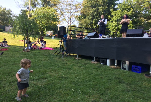 The concert starts at 6 PM and goes until 7:30 PM. There are 2 bands with a 10-minute break in between. Kids are welcome to roam the playground during the entire concert. So, if your little one is antsy, get up and take them around the playground. You'll probably want to bring a blanket or some chairs. We didn't, and I totally regretted it; the grass was a little wet.