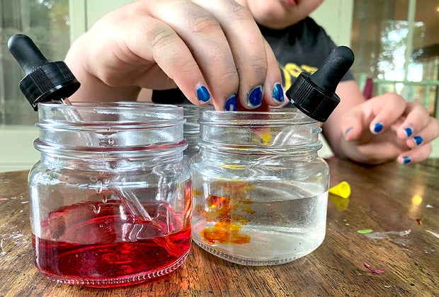 This experiment only requires food coloring, shaving cream, a glass jar, and pipettes. It's also just a fun craft project on rainy days for kids as young as preschoolers to tweens. Find more science experiments in our STEM and Science Activities Guide for Kids.