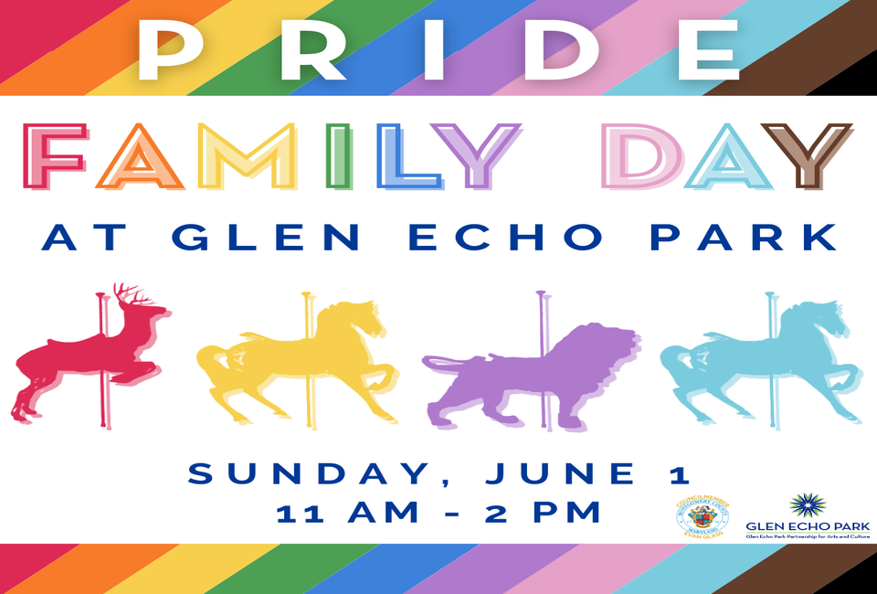 Glen Echo Park is proud to collaborate with the office of Montgomery County Council President Evan Glass to present the 5th annual Pride Family Day! Enjoy arts and crafts, FREE carousel tickets and Glen Echo Park Aquarium tickets (while supplies last), a special family photo op backdrop, face painting, and more.
