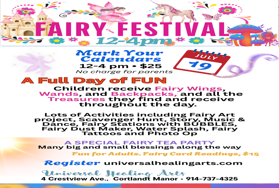 Step into a world of enchantment at the annual Fairy Festival at Universal Healing Arts, in Cortlandt Manor. This magical celebration offers a whimsical afternoon filled with fun, fantasy, and fairy-inspired activities for all ages. Guests are encouraged to dress in their fairy best and come ready to celebrate the joy, creativity, and wonder of the fairy realm.