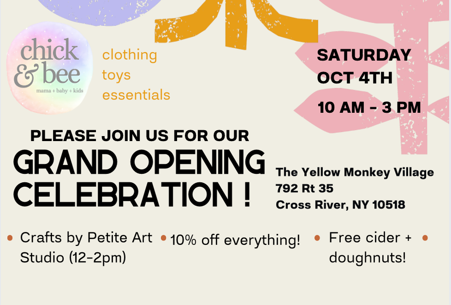 Bring the whole family for a fun-filled day at the grand opening of Chick & Bee Kids' first retail location. Petite Art Studio will be onsite from 12-2 with a special craft activity for the kids, enjoy free fresh apple cider + donuts while you shop, and get 10% off the entire store!