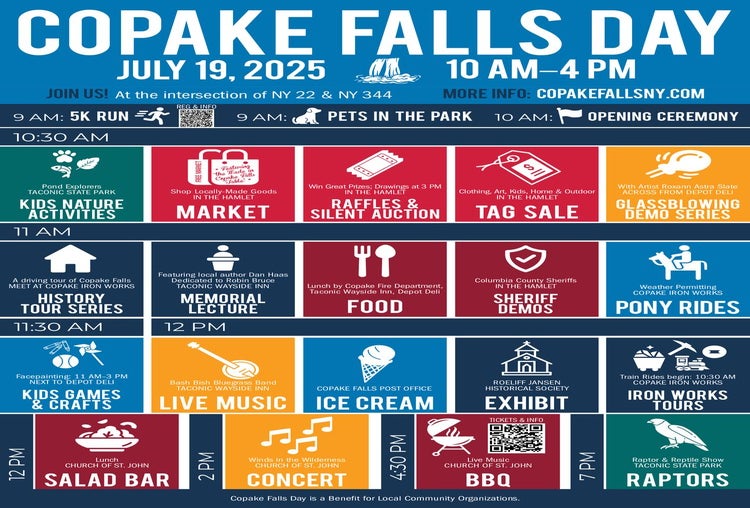 The annual Copake Falls Day celebration features live music, a barbecue, glass-blowing demos, and lots of activities for kids, including nature games, facepainting, pony rides, crafts, train rides, a raptor show, ice cream, Pets in the Park, and a movie in the park!