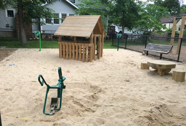 Right next to that play structure is a sand area. It’s not enclosed, so be mindful if you’re looking to keep sand out of the car (and your kid’s shoes). It was already stocked with some buckets and shovels, and it features a little house for creative play, as well as a wooden table and “chairs.” The best part—at least according to my all-things-construction-loving toddler—were the small, ride-on excavators that pick up sand. While they were a little heavy for his age, it would be ideal for a preschooler.