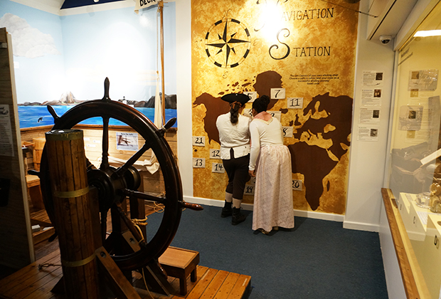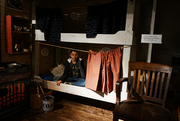 Another room showcases the second interactive exhibit, If I Were a Whaler. Here, kids play a variety of roles typical of the whaling age. There are costumes for dressing up, a general store with stocked shelves and play money, bunk beds, and even a potty seat. Visitors can have pictures taken while steering a real captain’s wheel, and try their hands at maritime tasks such as hoisting a sail, swabbing the deck, and tying a knot.