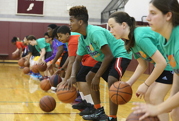 Kids huddle for instruction at a Chelsea Piers basketball clinic. Photos courtesy of the venue/organizations.